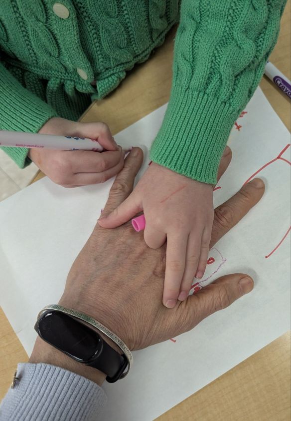 Another thing I’m grateful for in pre-K is time. I’m super grateful for, and really enjoy, the extra time there is to simply be in pre-Kindergarten. This gives us the opportunity to talk, share, develop relationships, play, explore, create. and learn. Today one of the girls was missing her mom. At the end of the day, she came over to me and told me. I asked her if there were anything I might do to help her. She said no, and just quietly stood next to me, her face devoid of joy. Then, she began to button the buttons on my denim jacket. She didn’t ask if she could do it, she just began to button them. Her sadness turned to determination and joy as she checked and buttoned each button — even rolling down my sleeves to button the cuffs. It was as if she felt and embodied the care and love of her mother, as she took care of me by buttoning my buttons.